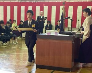 卒業証書授与では、名前を呼ばれた児童生徒は元気に返事をしました。証書を受け取る際には、会場全体から自然と拍手が送られ、 温かな雰囲気に包まれました。また、高等部卒業生は学校での思い出や支えてくれた家族への感謝、将来の目標などを、一人一人が凛とした姿で語りました。その言葉の力強さがこれまでの学びや成長の証であることを感じさせました。