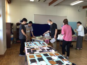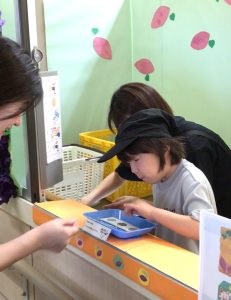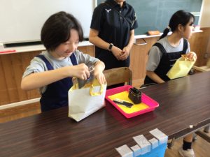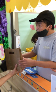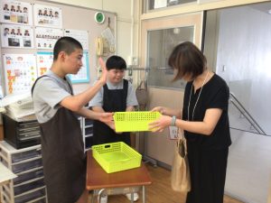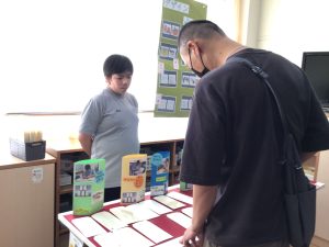 1・2・3組のお店では、レザーで作ったカードケースや写真入れ、マグネット、キーホルダーなどの製品や、木で作った敷物を販売しました。4・5組のお店では、生徒がデザインした封筒や缶バッジなどを販売しました。6・7組のお店では、木で作ったコースターや鍋敷き、プランターケースなどを販売しました。8・9組のお店では、畑で栽培したサツマイモを販売しました。生徒たちは、袋詰めやお金の受け渡しなど、自分が担当する係活動に精一杯取り組みました。大勢のお客さんを前にして恥ずかしそうにする生徒や嬉しそうに笑顔で接客する生徒、緊張した表情で係の仕事に集中する生徒など、様々な姿が見られました。お店には保護者の方が次々と来店し、長い行列ができるほど大盛況でした。