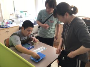 最初に、生活単元学習や体育、美術、音楽などの学習の様子を動画で発表しました。その後は、作業学習グループごとに日ごろの学習で製作した製品を売るお店を開きました。